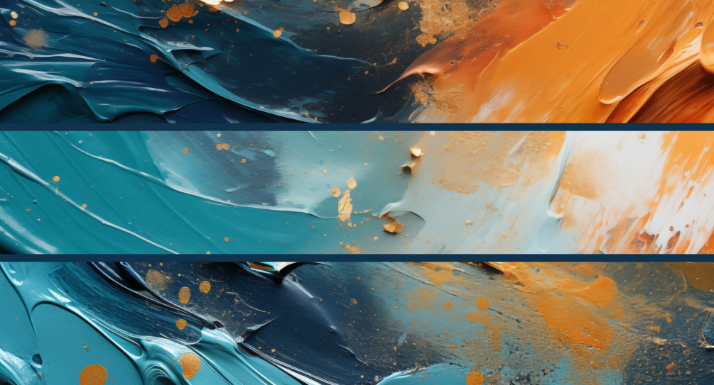 Ultra high resolution abstract paint compositions in teal, orange, yellow and gold.