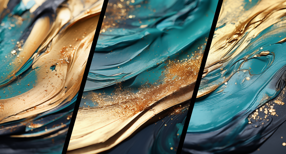 Ultra high resolution abstract paint compositions in emerald, black and gold.