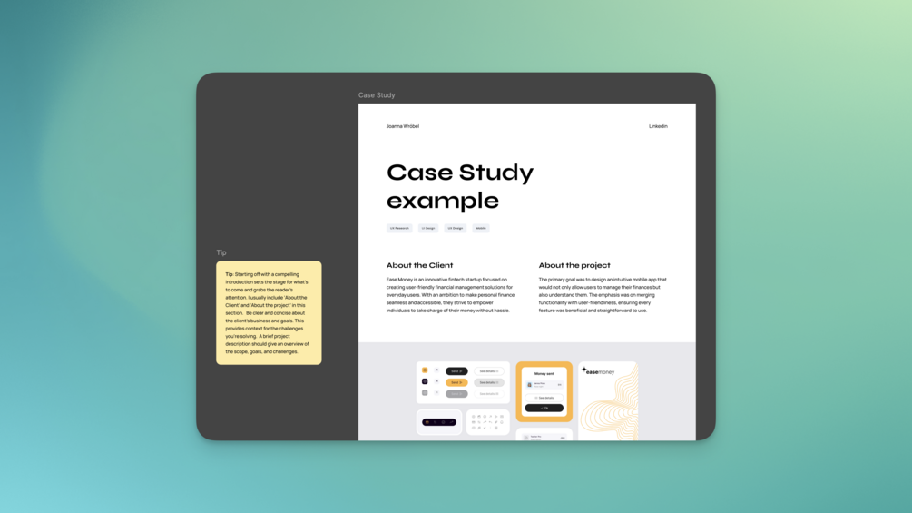 Whether you’re documenting a freelance project, preparing your portfolio, or creating visuals for a UX challenge, this layout helps you focus on your story in the project.